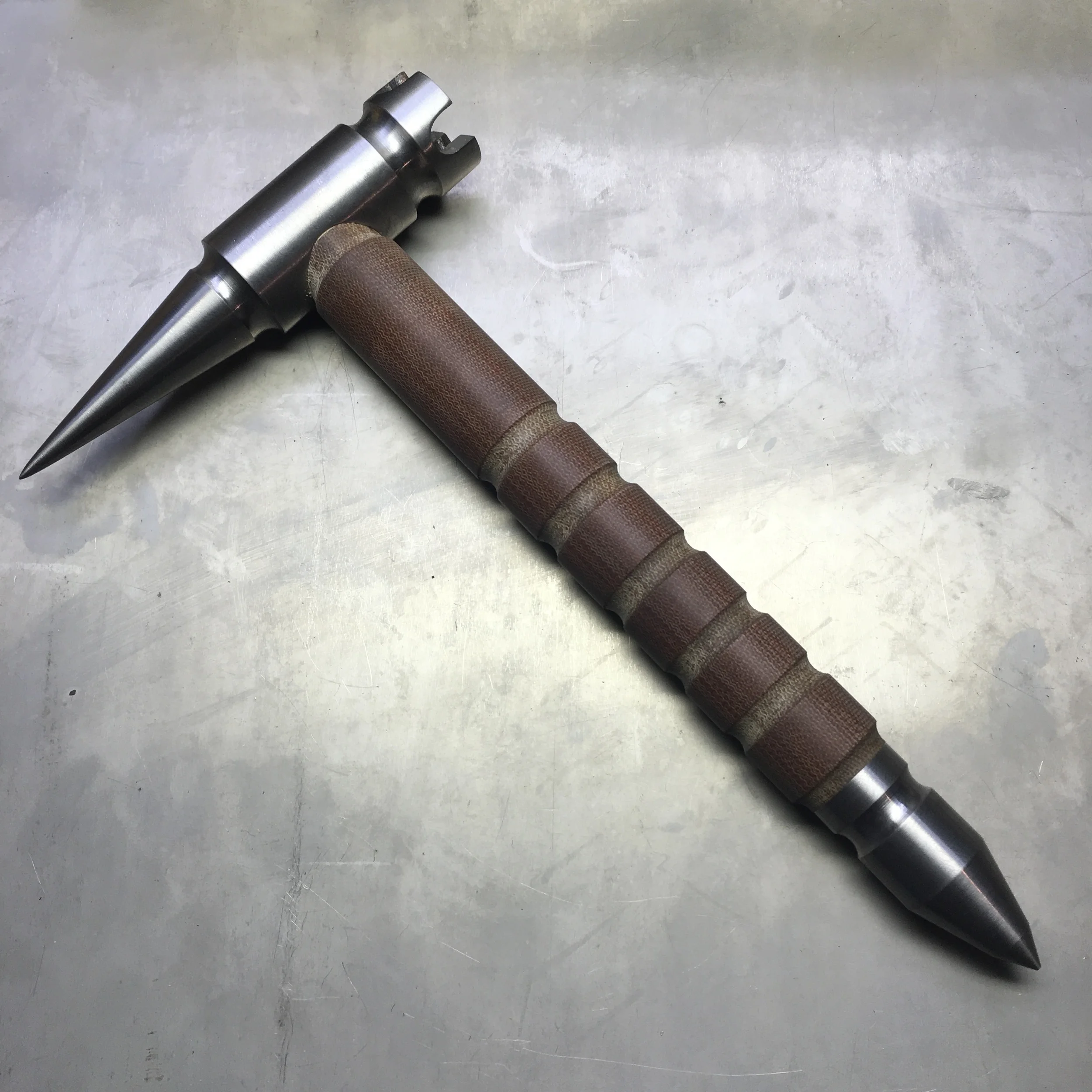 With the addition of a milling machine to my equipment arsenal I'll be adding more War Hammers to my inventory. I have been making them out of titanium and micarta. In the future more materials for the heads will be used (O1 tool steel is in the shop currently). Different handle materials and attachment configurations are also in the works. Hammers will range in price from $175 to $400 depending on size and materials.